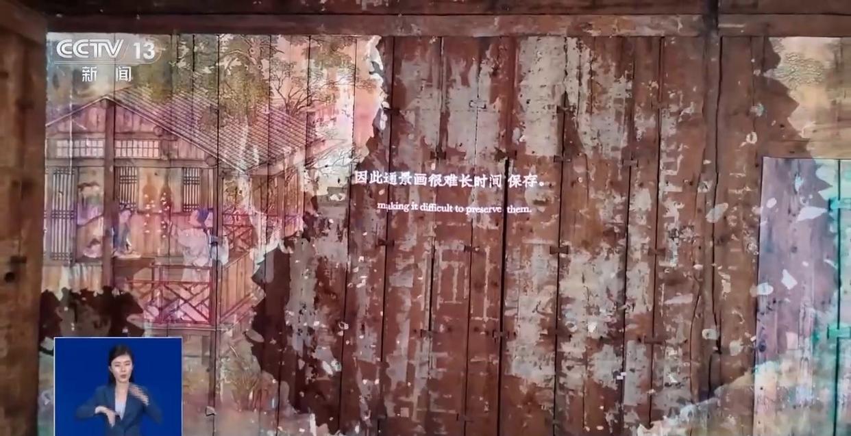 故宫博物院古建部副研究馆员 刘梦雨:这就是一个非常珍贵的历史信息,所以我们就决定把整面墙原状保存下来,不做扰动,并且用投影多媒体的方式跟观众讲解这个通景画残片所承载的历史信息,讲解这个通景画的制作工艺和历代修缮经过。