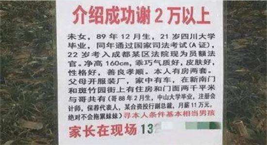 最近,有一位29岁女子的征婚启事很火。征婚启事写着:八九年生,毕业后通过国家司法考试(A证),现为公务员。气质好,皮肤好,性格好,善良孝顺。有两套房,父母开服装厂,与哥哥共同拥有2000平米门面,哥哥月薪11万元,绝对不会拖累妹妹。最关键的是相亲启事上面非常醒目的写着:介绍成功答谢2万元以上。