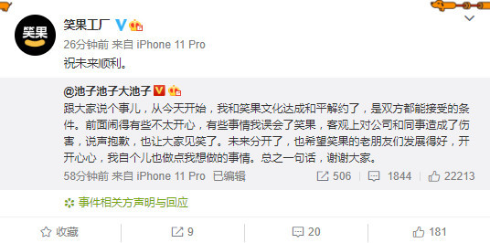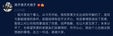 一笑泯恩仇?池子与笑果文化和平解约, 这段时间一直在谈,内容均确认过 腾讯新闻 2020-08-21 09:10:16 A+ A- 池子此前正和笑果文化打官司。5月6日时,池子发表声明讲述了自己与笑果文化的恩怨以及其他边角料。8月21日,池子发表动态表示"我和笑果文化达成和平解约",并解释"有些事情我误会了笑果",加上一些轻飘飘的祝福。 笑果工厂官微在半小时后转发并回复池子的微博,“祝未来顺利”。 池子一段本是很正常的和平解约声明,却被老粉发现了很多异样之处,比如文案在开篇有一个冒号,而且通篇没有繁体字。 上一页1/5下一页