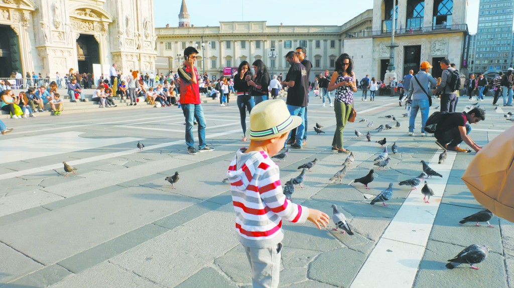 国庆期间笔者的欧洲之行第一站就是米兰多姆大教堂,怀着一颗圣洁的心参观完教堂走出大门,4岁的孩子立刻被广场上大群的鸽子吸引住了(如图),高兴地跟在鸽子后面追逐玩耍。这时,一个小伙子走过来,往孩子手里塞了一把喂鸽子用的玉米粒,小朋友追得正开心,压根没注意是谁递给他玉米粒,乐滋滋地抓过来就喂鸽子。趁孩子玩得不亦乐乎,小伙子试图继续往孩子身边的大人手里塞玉米粒,这时笔者已隐隐感觉不对劲,但心想一把玉米粒也没多少钱,就没有阻止孩子的玩乐。