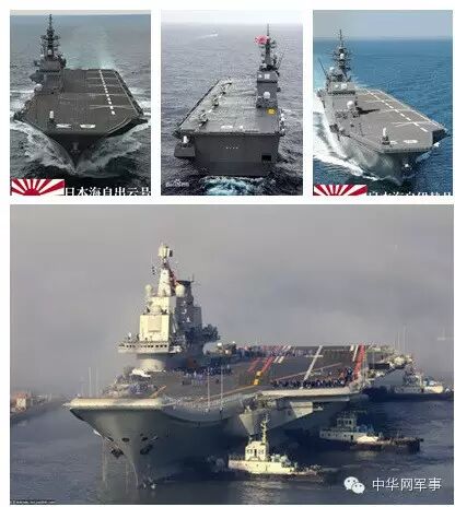 上方从左至右分别为出云级出云号、日向级日向号、日向级伊势号直升机母舰,下方为辽宁号航空母舰