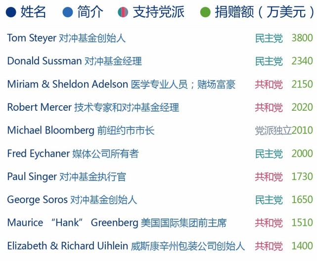 每轮大选周期,超级富豪一掷千金的报道必不会少。今年的带头大哥是对冲基金大佬Tom Steyer和Donald Sussman,两人分别拿出了3800万美元和2340万美元。超级富豪们将创纪录的天量资金注入大选,所依赖的撒钱工具正是2010年后横空出世的Super PACs。