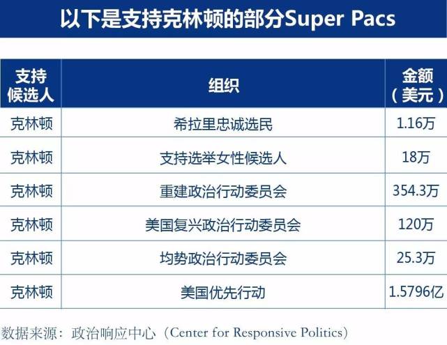 据彭博社统计,截至10月27日,支持克林顿的Super PACs共筹集了超过2亿美元资金,支持特朗普的Super PACs则筹得了5910万美元,基本同他自己拿出的钱相当。