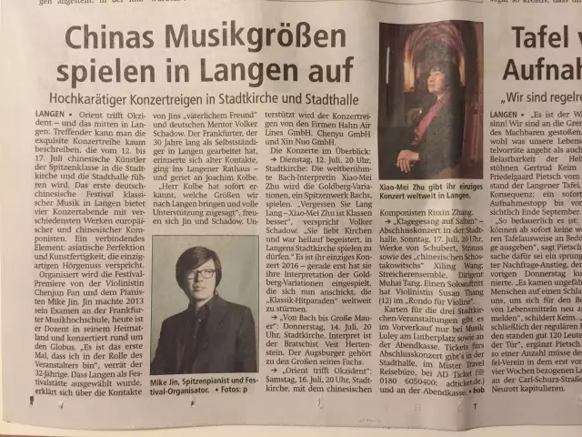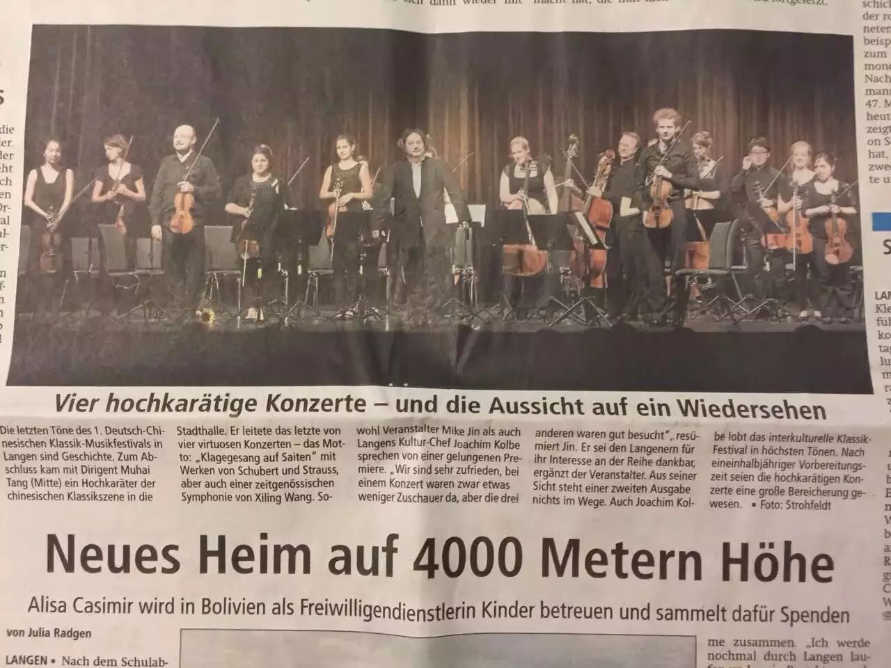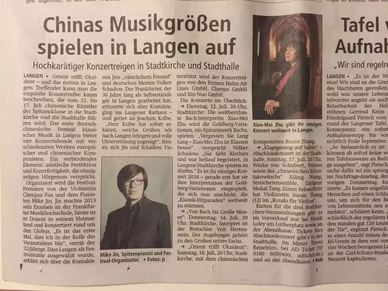 2016年,他又作为音乐总监创建了第一届中德古典音乐节,请来享誉国际乐坛的“巴赫专家”朱晓玫、“中国肖斯塔科维奇”的作曲家王西麟等音乐家,献上了被朗恩市市长赞叹为“朗恩市千年建城史上最特别的夜晚之一”的演出。