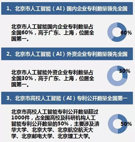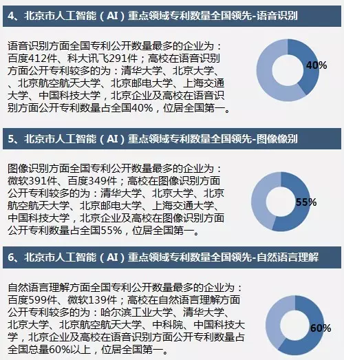 北京市国内企业人工智能专利公开数量领先全国。在国家知识产权局的网站上,我国人工智能专利申请的数量超过7000件,北京、上海、广东为中国人工智能专利数量分布的三大中心,企业人工智能专利公开数量最多的企业为百度、腾讯、科大讯飞、华为、中兴通讯、奇虎360、小米、阿里巴巴等,涉及的技术内容有语音识别、图像识别、自然语言理解、用户画像、自动驾驶、云计算、移动终端的智能交互等,多数企业分布在北京,专利公开数量占全国总体数量超过60%以上,高于广东、上海等其他城市,位居全国第一。