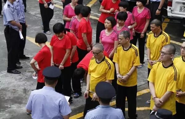 2015年5月27日,包括梁耀辉(穿黄衣者左一)在内的47人出庭受审。