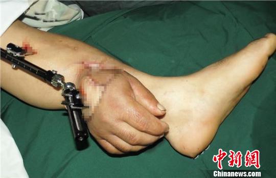 高师傅的断手“寄养”在小腿上。杨俊辉摄