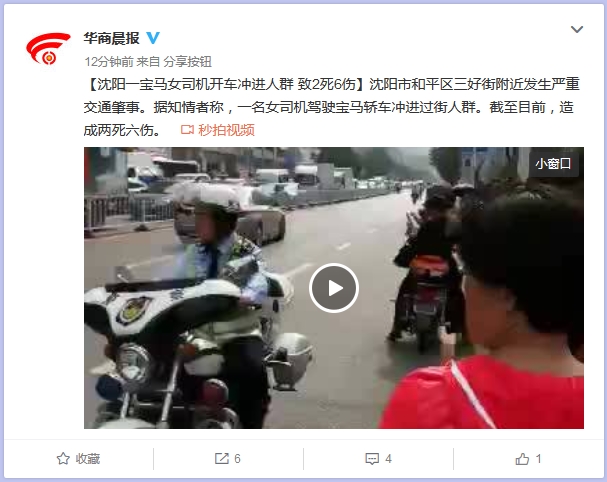 [沈阳一宝马女司机开车冲进人群致2死6伤]沈阳市和平区三好街附近发生严重交通肇事。据知情者称,一名女司机驾驶宝马轿车冲进过街人群。截至目前,造成两死六伤。