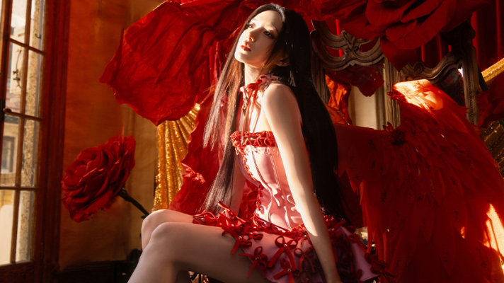 程潇穿粉红短裙配长直发置身红玫瑰间 暗黑童话风造型惊艳吸睛