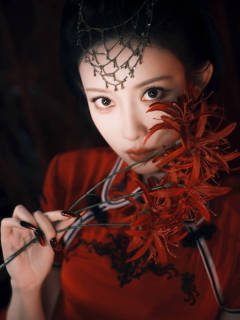 孟子义穿红色旗袍身姿曼妙 手持羽毛扇冷艳动人