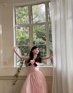 章若楠穿粉抹胸裙明媚娇俏 托脸沉思好似千禧公主