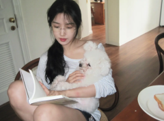卢昱晓穿单肩上衣与小狗互动 回眸浅笑清纯甜美