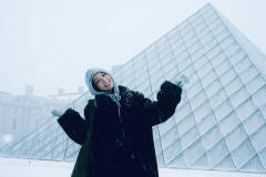 周也晒法国看雪照笑容灿烂 穿黑色大衣五官精致