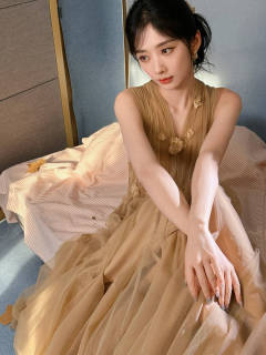 张婧仪穿棕调吊带裙肩颈诱人 手拿竹杖笑容甜美