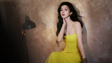 哈妮克孜穿明黄吊带裙性感妩媚 大波浪发型明艳靓丽