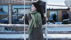 章若楠在雪地里荡秋千笑容甜美 长发微卷清冷温柔