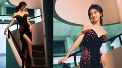 鞠婧祎穿露肩黑裙挽长发 光影下美貌撩人