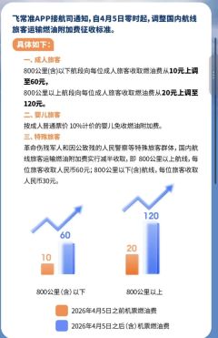 国内航线燃油附加费自4月5日起确认上调:800公里以下60元,800公里以上120元