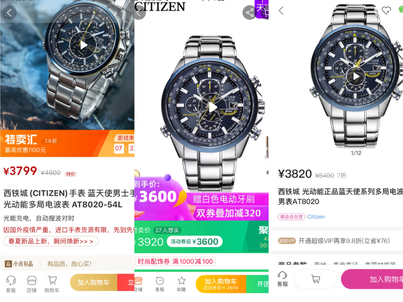 以西铁城光动能表系列AT8020-54L为例,其在小米有品“名品折扣”频道中的售价为3799元,同款产品在唯品会的售价为3820元,在天猫奢品中售价为3920元,不过用户在使用优惠券后的到手价仅3620元。