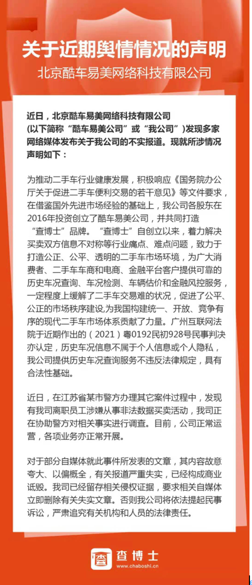 查博士运营主体为北京酷车易美网络科技有限公司,成立于2016年1月,为二手车交易服务平台,官网介绍称其拥有历史车况、车辆检测、汽车保修、二手车估价、金融风控五大业务。