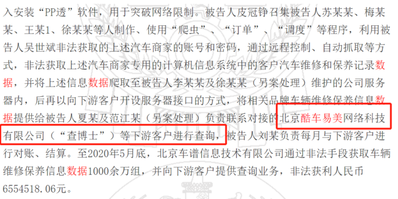 另一被告人皮冠铮召集相关被告人制作、使用“爬虫”、“订单”、“调度”等程序,利用吴世斌非法获取的上述汽车商家的账号和密码,通过远程控制、自动抓取等方式,非法获取上述汽车商家专用的计算机信息系统中的客户汽车维修和保养记录数据,并将上述信息数据爬取至被告人李某某及徐某某(另案处理)维护的公司服务器内,后再以向下游客户开设服务器接口的方式,将相关品牌车辆维修保养信息数据提供给被告人夏某及范江某(另案处理)负责联系对接的北京酷车易美网络科技有限公司(“查博士”)等下游客户进行查询,被告人刘某负责每月与下游客户进行对账、结算。至2020年5月底,北京车谱信息技术有限公司通过非法手段获取车辆维修保养信息数据1000余万组,并向下游客户提供查询业务,非法获利人民币6554518.06元。