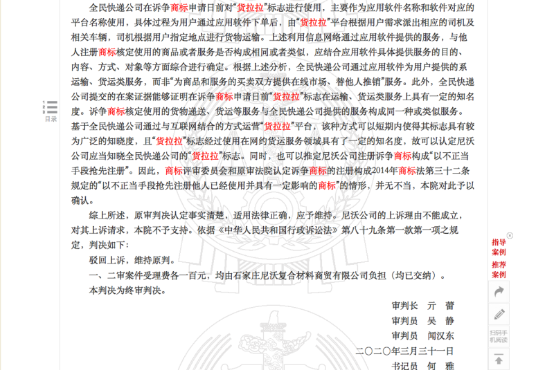 随后,尼沃公司提起了上诉。二审中,北京市高级人民法院认为,全民快递有限公司提交的证据能够证明在诉争商标申请日前,其授权关联公司使用“货拉拉”标志,且该标志经过使用在网约货运服务领域具有了一定的知名度,故可以认定尼沃公司应当知晓全民快递有限公司的“货拉拉”标志,也可以推定尼沃公司注册诉争商标构成“以不正当手段抢先注册”,因此驳回上诉,维持原判。