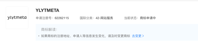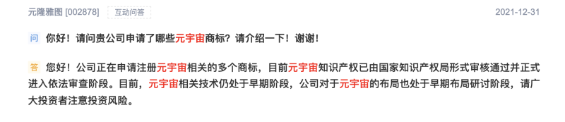 天眼查App显示,元隆雅图关联公司北京元隆雅图文化传播股份有限公司于近期申请注册多个元宇宙相关商标,包括“元宇宙”“奇点元宇宙”“YLYTMETA”等,国际分类涉及科学仪器、广告销售等,目前商标状态为商标申请中或等待实质审查。