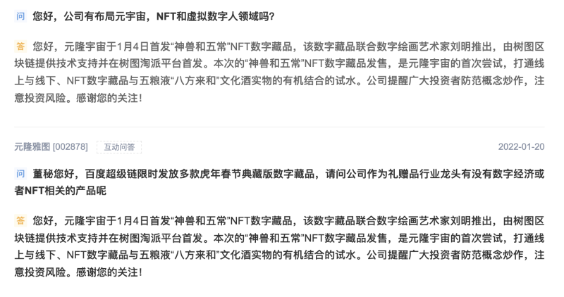 蓝鲸财经注意到,曾在2021年底于深交所互动易平台表示,致力于成为礼品元宇宙的定义者。并表示将进军元宇宙并推出数字礼品,而且正在申请注册元宇宙相关的多个商标,相关元宇宙知识产权已由国家知识产权局形式审核通过并正式进入依法审查阶段。