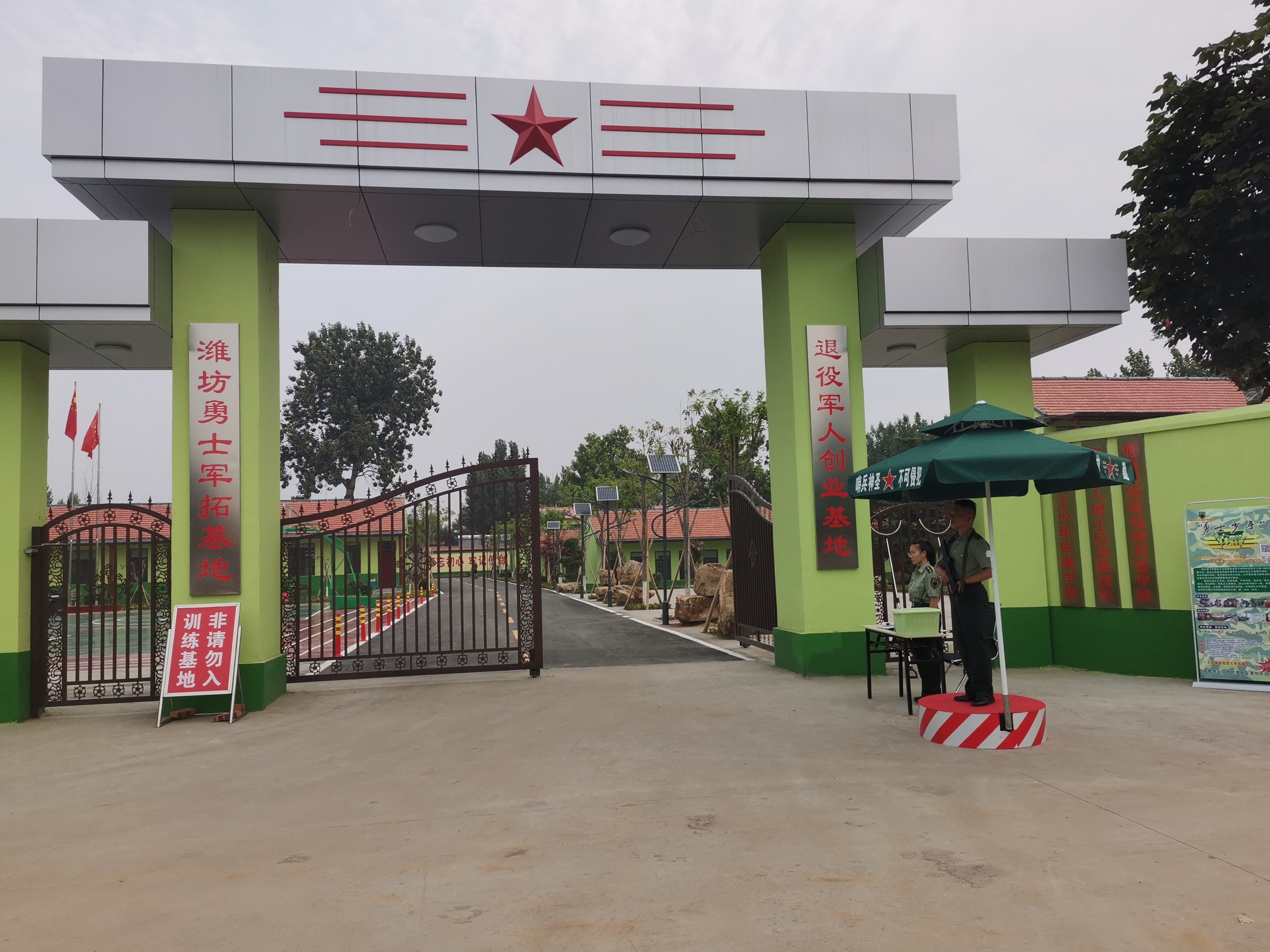 潍坊勇士退役军人创业基地位于潍坊市昌乐县实验中学南500米,毗邻宝通街,距市区20公里,占地40余亩,总建筑面积5000平方米,总投资1500余万元。基地理位置优越,交通便利,环境优雅,功能齐全,设施先进。内设有半封闭式的军事化训练场、兵器展台、心理行为训练场、国防教育影视资料播放厅、多功能会议室、餐厅、接待楼等配套设施,可同时容纳800人餐饮、住宿、培训和会议。是开展全民国防教育、退役军人创业就