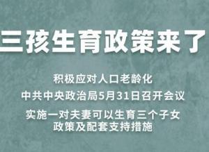 中共中央政治局5月31日召开会议,会议指出,进一步优化生育政策,实施一对夫妻可以生育三个子女政策及配套支持措施,有利于改善我国人口结构、落实积极应对人口老龄化国家战略、保持我国人力资源禀赋优势。